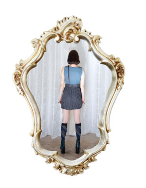 A one of a kind blue striped sarafan-transformer dress made of Italian linen. 3 in 1. The sarafan dress transforms into a skirt and a bag parts by internal buttons and factors.