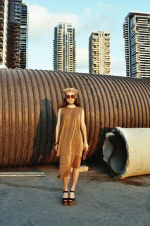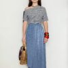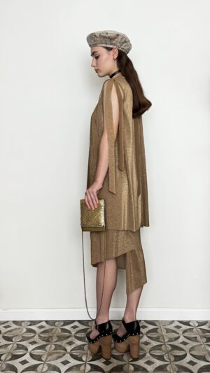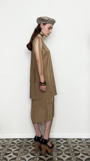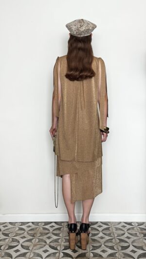 TWO-PIECE SUIT MADE FROM VISCOSE TRICOT WITH LUREX IN GOLD METALLIC SHADE. ASYMMETRICAL AND PLAYFUL, DESIGNED FOR A FESTIVE OR EVENING LOOK. THE A-SHAPED TUNIC AND ASYMMETRICAL PENCIL SKIRT CAN BE PURCHASED SEPARATELY.