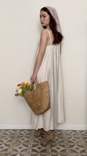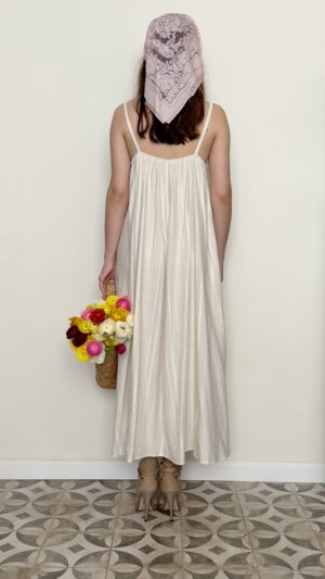 MADE FROM NATURAL MILK-COLORED STRIPED SUITING FABRIC, THIS DRESS FEATURES A DIAGONAL CUT THAT DRAPES BEAUTIFULLY ON THE BODY. THE SILHOUETTE FLARES WIDE AT THE BOTTOM INTO A HALF-SUN SHAPE.
