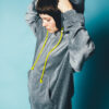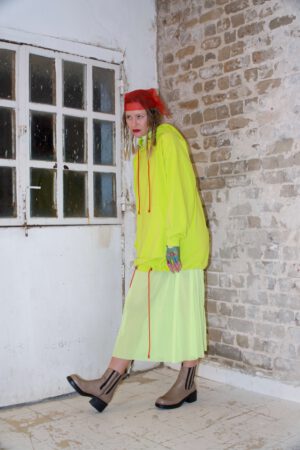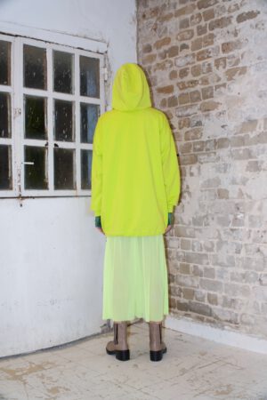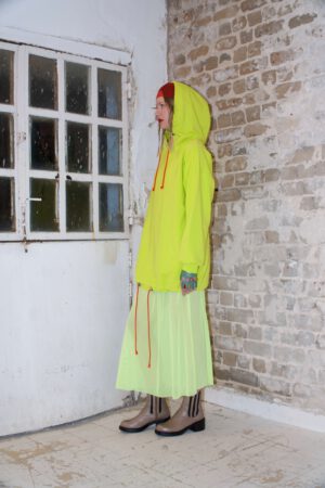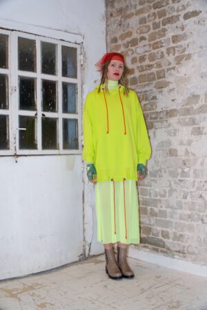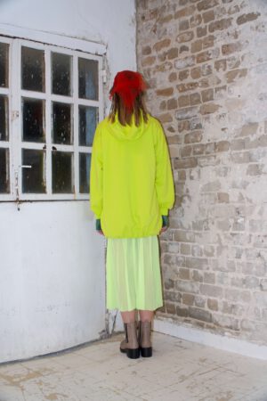 A one of a kind oversized acid MARY’N hoodie is made out of 100% Italian cotton with no fleece. One kangaroo pocket on the front, the hood with red drawstrings, gathered at cuffs n’ drawstrings at hipsline.