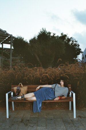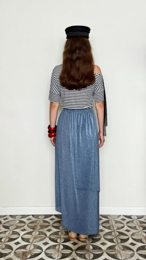 LONG ASYMMETRICAL SKIRT MADE FROM VISCOSE TRICOT WITH LUREX IN METALLIC BLUE. FEATURES A SOFT, WRAP-LIKE SILHOUETTE THAT DRAPES BEAUTIFULLY AND MOVES WITH EASE.