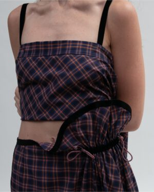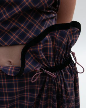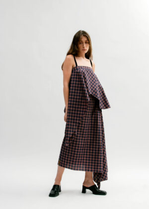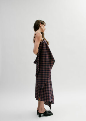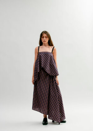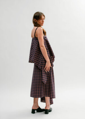 One of a kind asymmetric cotton skirt suit. The skirt is made by draping and the top is made out of the fabric leftovers. The top straps are made out of black velor. The skirt has a unique elastic fixator so it fits different sizes (S/M/L). The checkered textile is in purple-ginger colors.