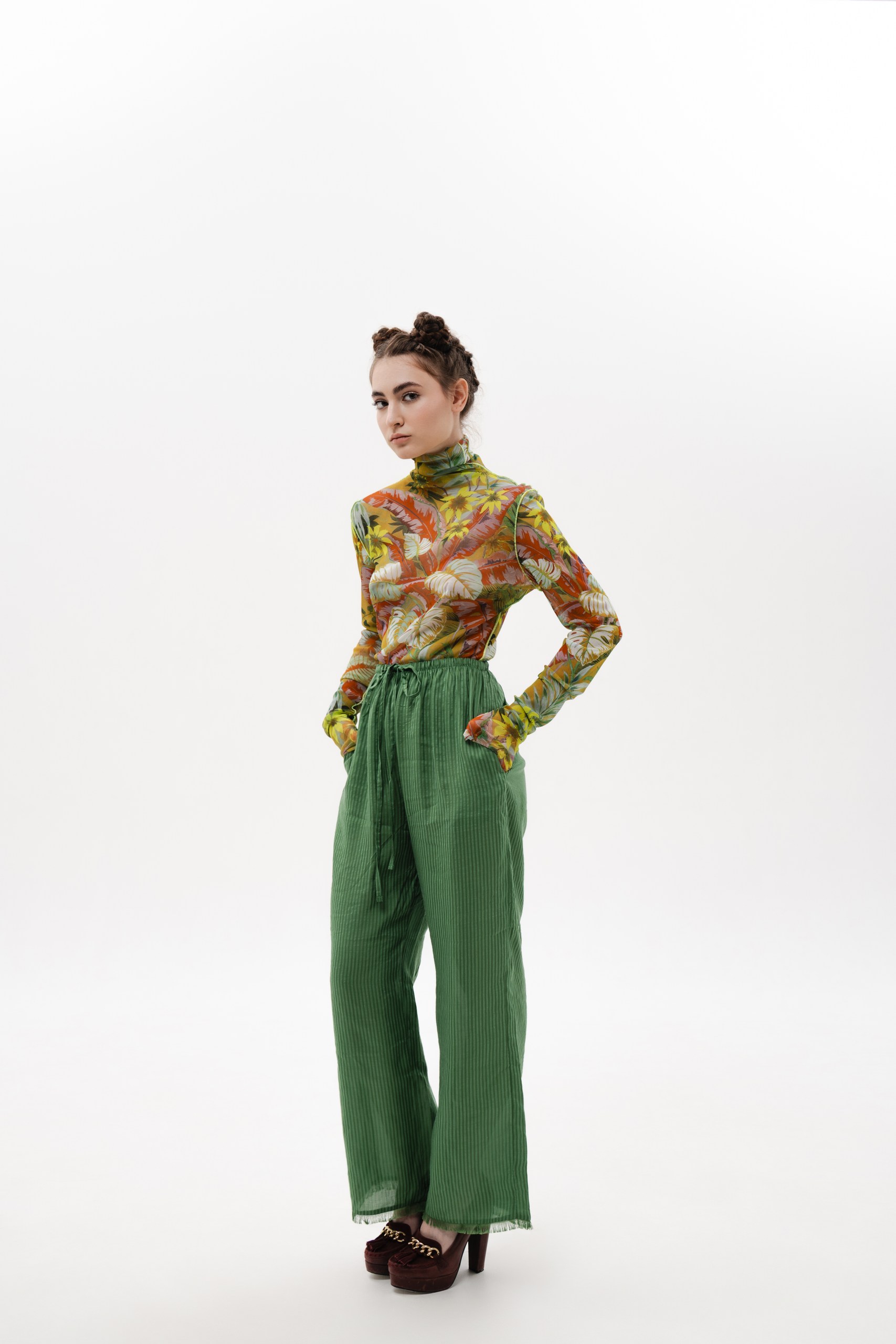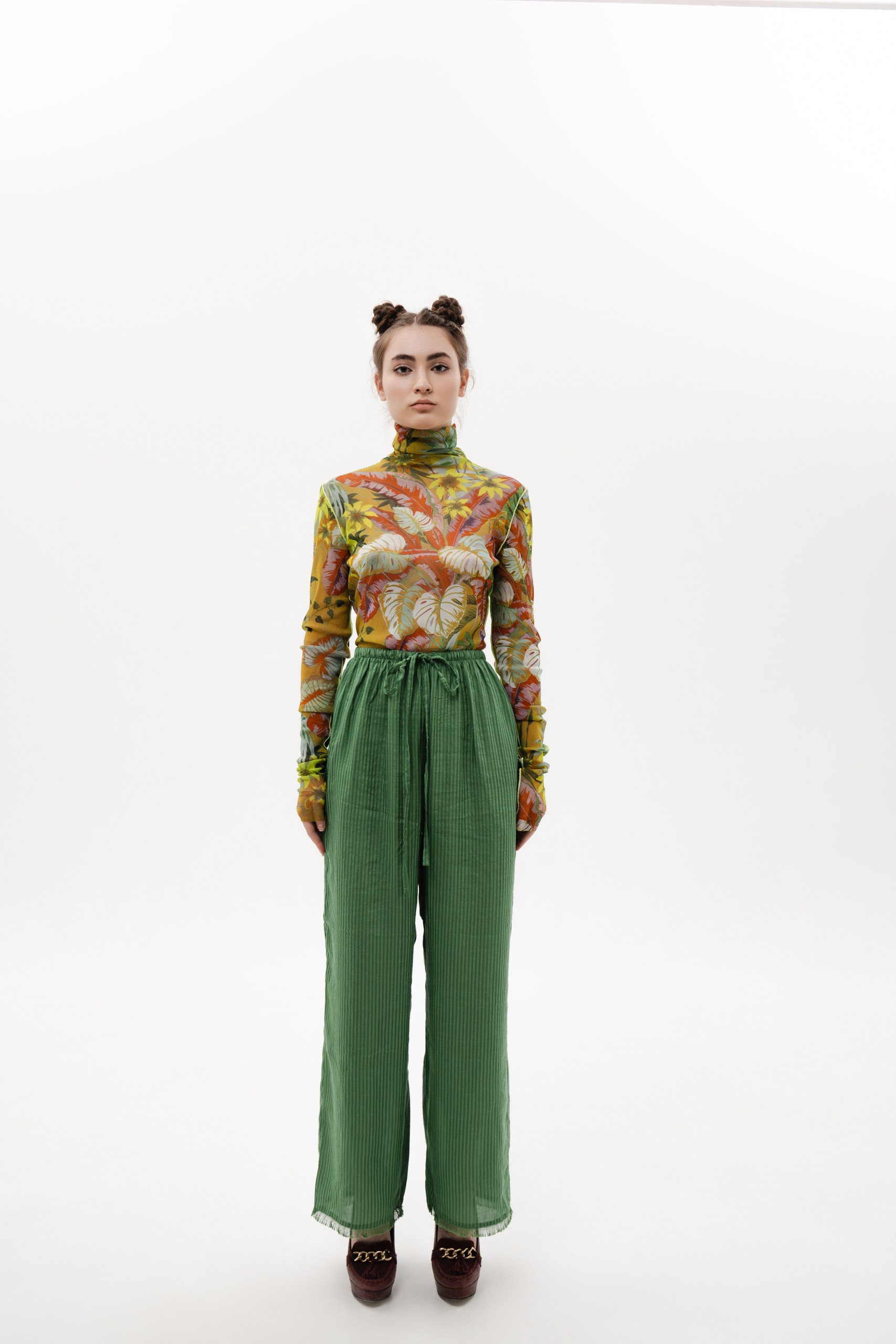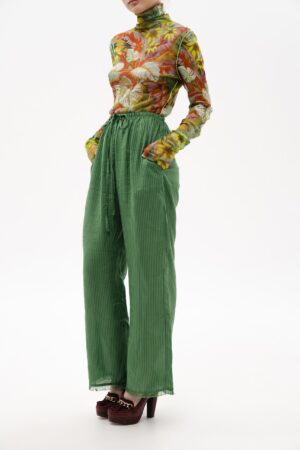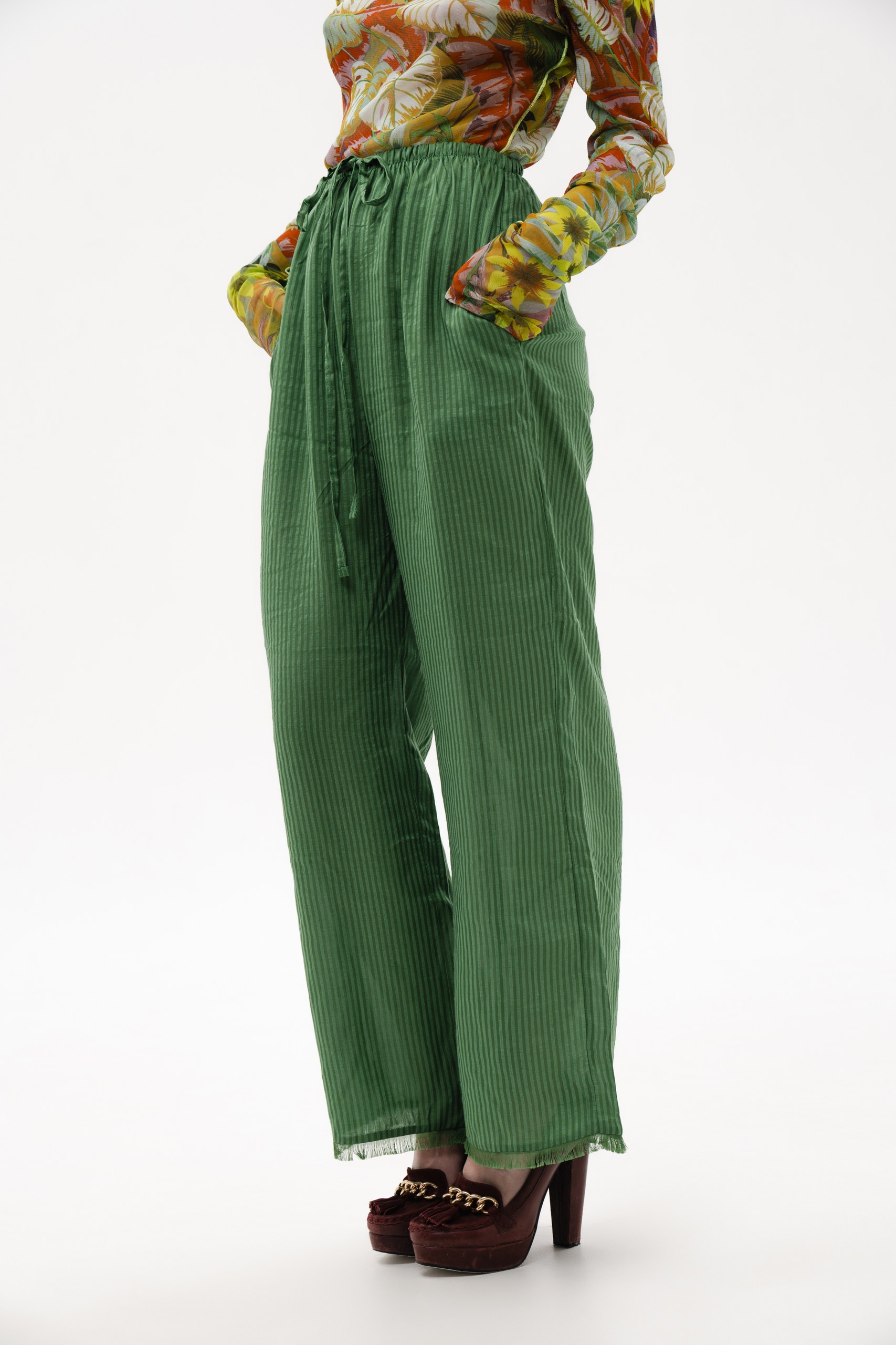 CRAFTED FROM GREEN ITALIAN VISCOSE-LINEN WITH A SOFT STRIPED TEXTURE.