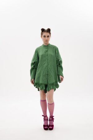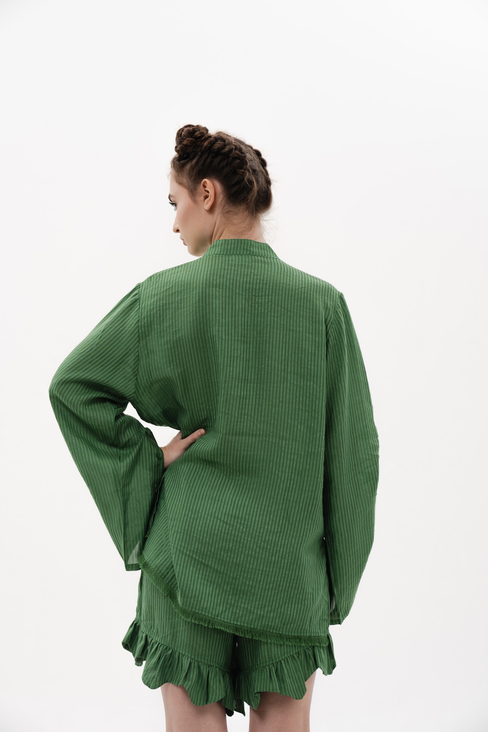 CRAFTED FROM GREEN ITALIAN VISCOSE-LINEN WITH A SOFT STRIPED TEXTURE.