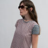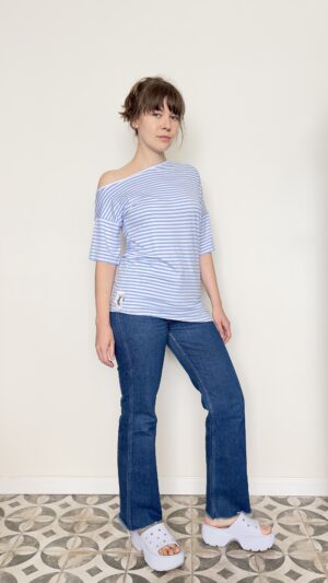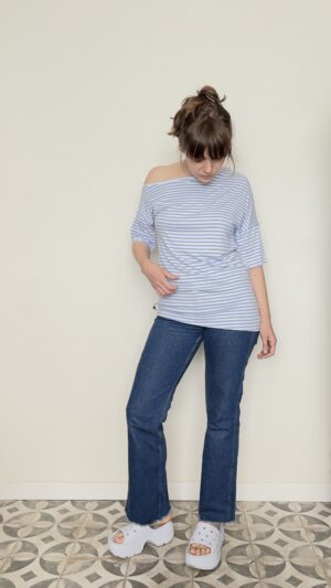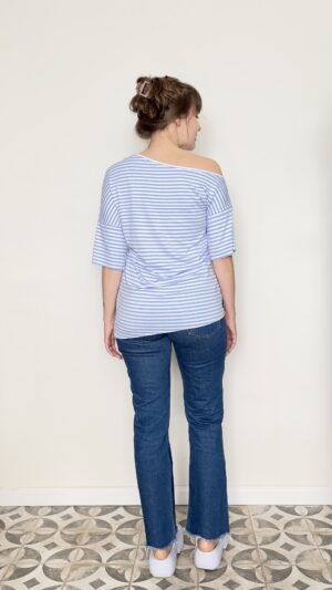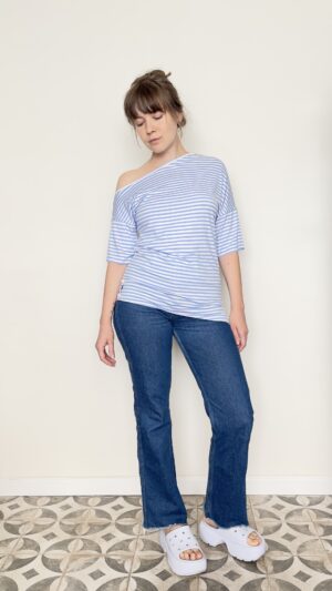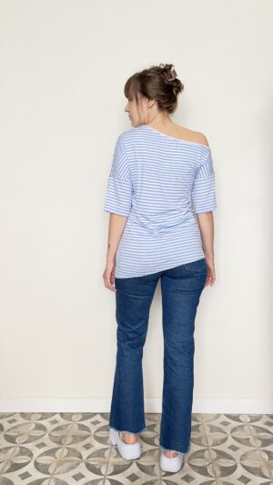 ASYMMETRICAL ONE-SHOULDER T-SHIRT MADE FROM SOFT STRIPED TRICOT IN SHADES OF BLUE. One size (fits XS-S)