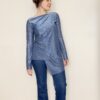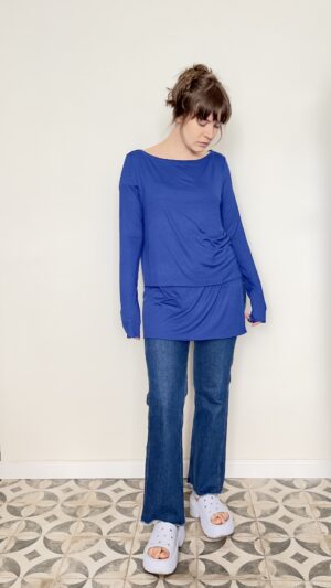 ASYMMETRICAL ROYAL BLUE LONGSLEEVE MADE FROM TRICOT USING A UNIQUE ZERO-WASTE TECHNIQUE WITH MINIMAL CUTTING. STANDS OUT WITH AN UNUSUAL, SCULPTURAL SILHOUETTE.