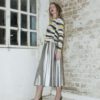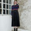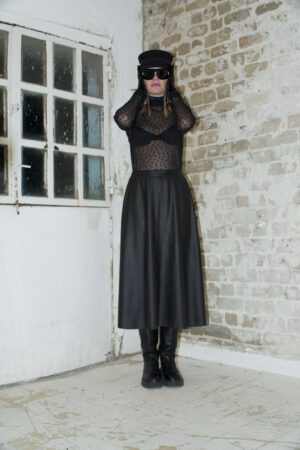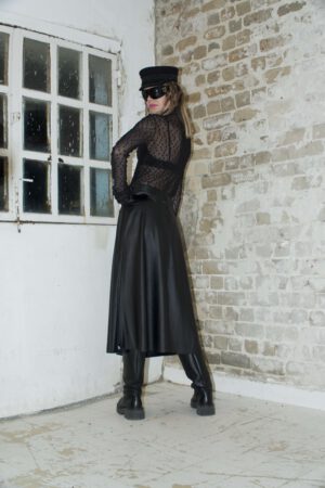 One of a kind “A” silhuette MARY’N reversible black skirt. Actually 2 in 1. One side is smooth eco-leather, the other side is suede. Under-the-knee length.