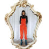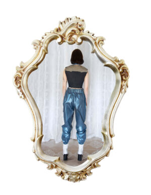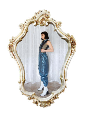 A one of a kind metalic blue overall-transformer made of Italian cotton. Oversized silhouette. 3 in 1. The overall transforms to oversized trousers and a bag parts by internal buttons and factors.