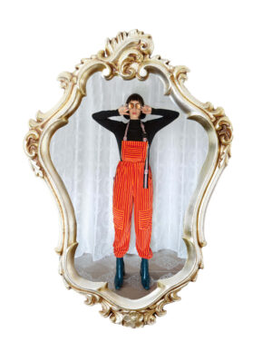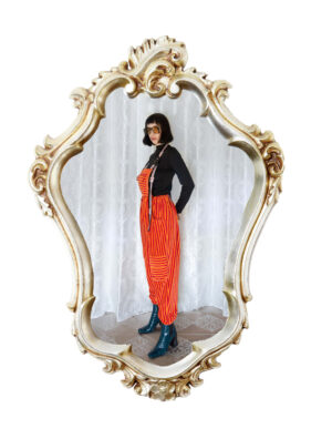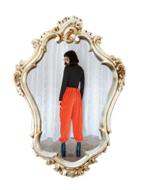 A one of a kind orange and red stripes overall-transformer made of Italian velour.
